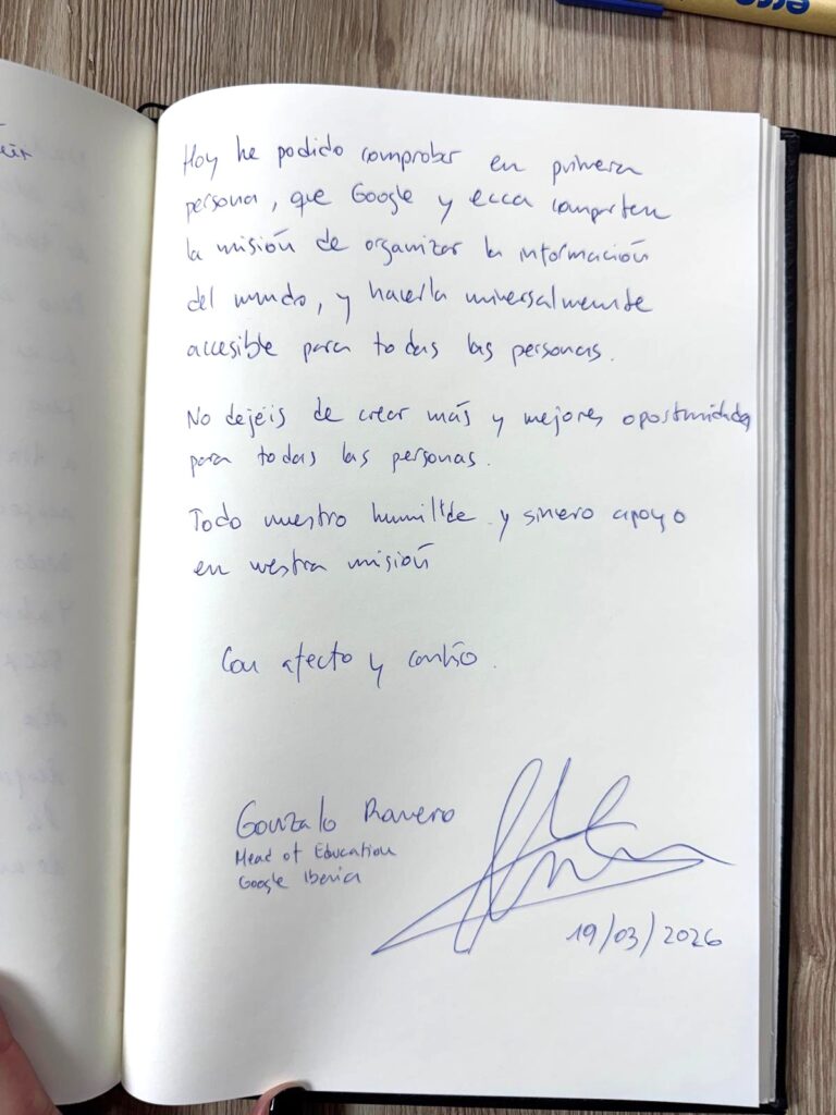 En ecca.edu, hemos tenido el honor de recibir en nuestras instalaciones a Gonzalo Romero, director de Educación de Google para España, Portugal y Andorra. Este encuentro ha servido para estrechar lazos en torno a la innovación educativa y mostrar cómo nuestra institución lidera el cambio tecnológico en la formación de personas adultas.