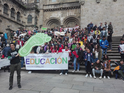 Más de 200 niños y niñas de siete centros educativos gallegos: CPR Santa María do Mar (A Coruña), IES Eduardo Pondal (Santiago), CPR Divino Maestro (Santiago), CPI Virxe da Cela (Monfero), IES Arzebispo Xelmírez I (Santiago), IES Campo de San Alberto (Noia) e IES de Vilalonga (Sanxexo) reclamaron hoy ante responsables de educación y cooperación de la Xunta de Galicia (José Manuel Pinal, director xeral de Centros e Recursos Humanos de la Consellería de Educación y Pilar Romero Subdirectora Xeral de Cooperación) e del Concello de Santiago de Compostela (Concepción Fernández Concelleira de Benestar Social y Manuel Dios Concelleiro de Educación), que la educación es una herramienta clave para la construcción de la paz. En esta edición el objetivo principal es defender y proteger la educación de todos los niños y niñas que se encuentran en países afectados por conflictos armados o catástrofes naturales.