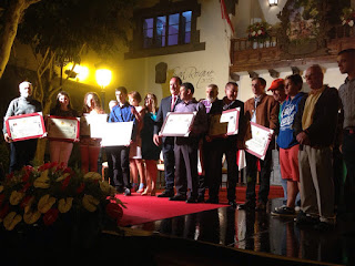 El conjunto de las instituciones y personas reconocidas posan junto al Alcalde de Firgas en la noche del 31 de julio |