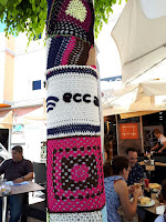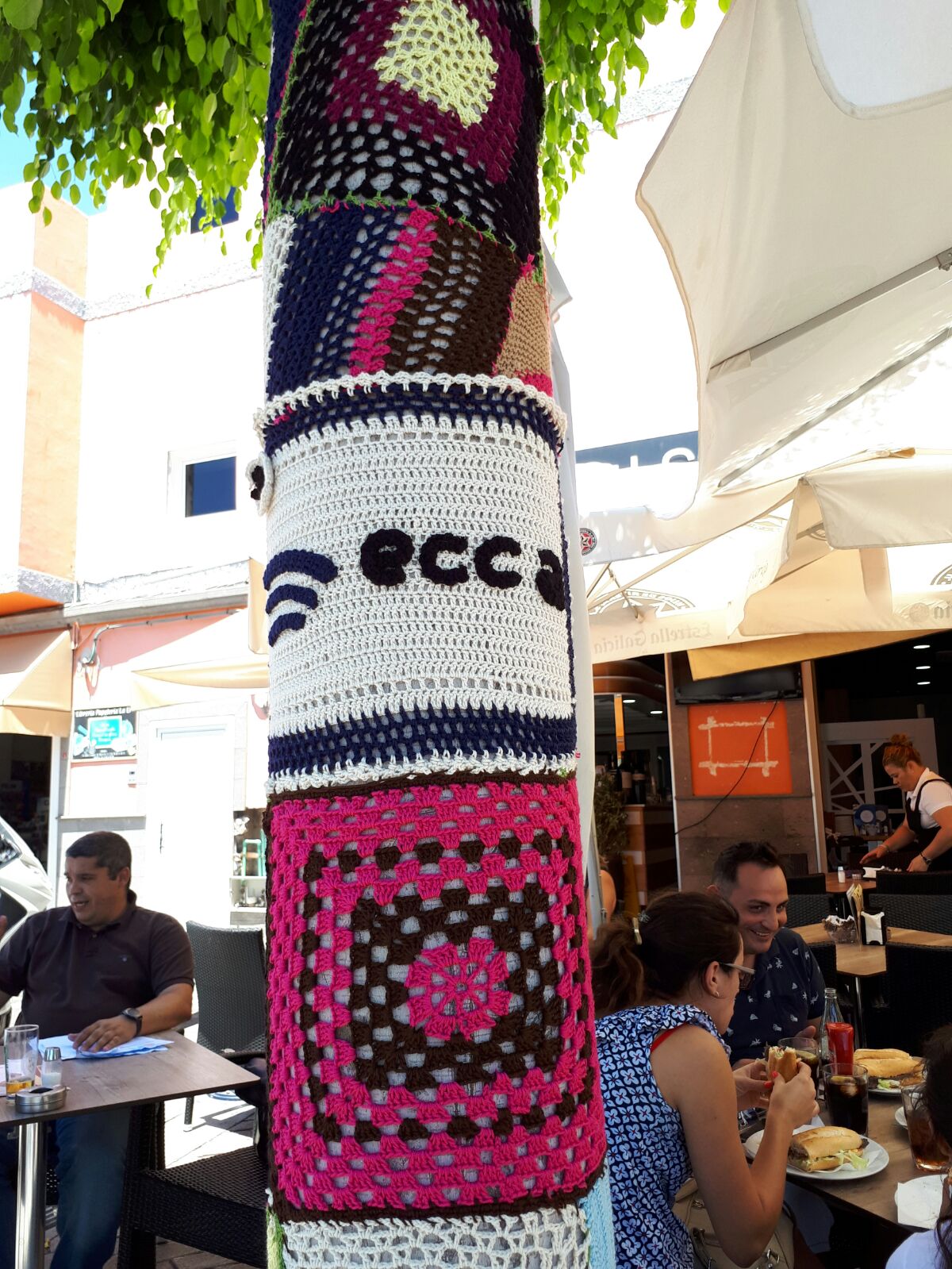Para anunciar las actividades del día mundial de tejer en público, que tendrá lugar el viernes 9 de junio, el equipo ECCA Sur de Gran Canaria se sumó activamente al «Yarn Bombing»-término con el que se designa al arte de decorar mediante ganchillo diferentes elementos urbanos-. Durante la jornada, el logo de ECCA viste a un árbol de la Plaza de La Era en Vecindario (Santa Lucía, Gran Canaria). La participación de profesorado y alumnado de ECCA contó con la visita de la alcaldesa del Municipio, Dª. Dunia González. Una de nuestras compañeras, Vanessa Santana, comenta: «En un ratito aprendí a dar punto». ¡¡Buen aprendizaje!!